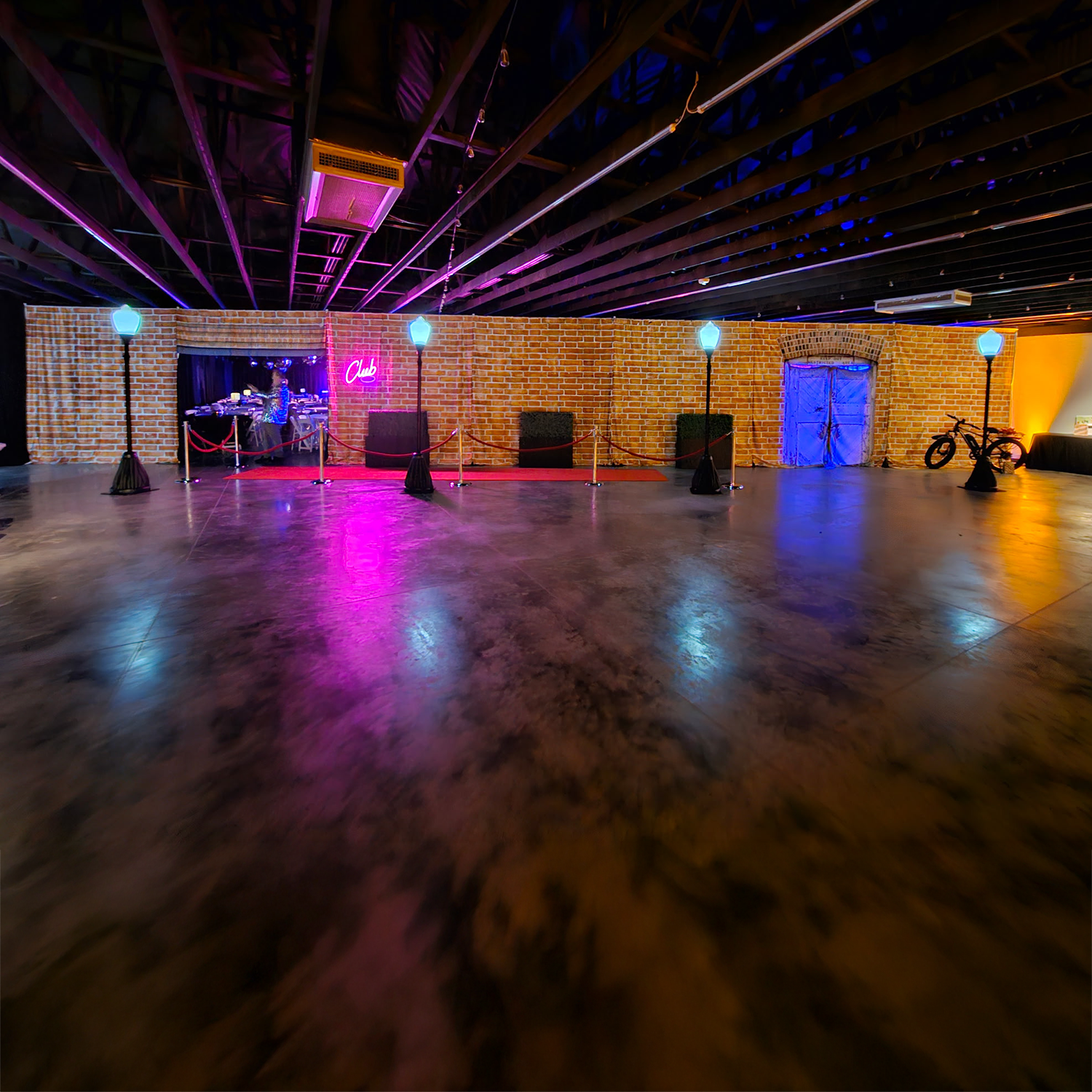 This is a 65 foot long by 12 foot tall drape wall that appears like a New York City street.